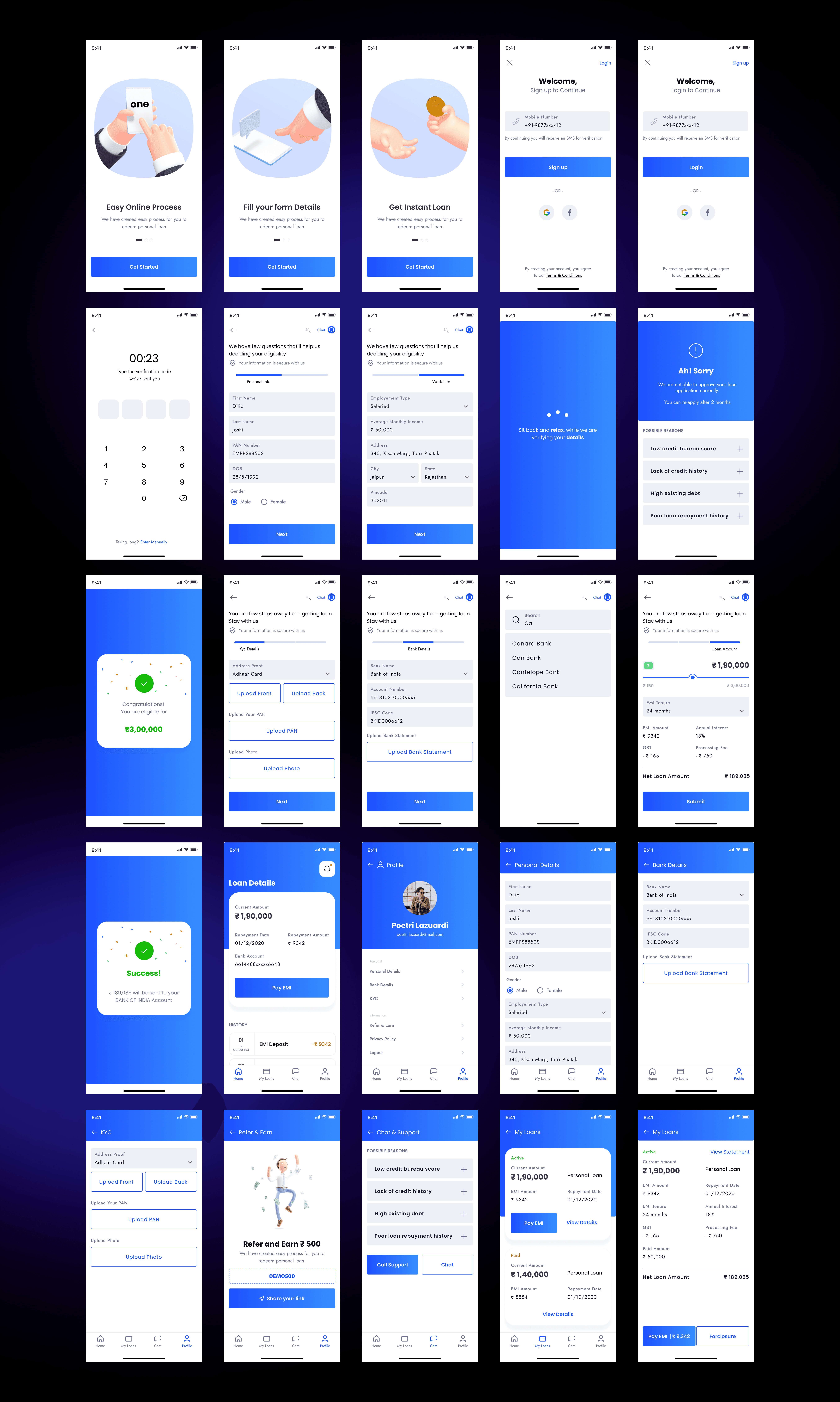 Profile Section: Outlined sections for personal information (name, PAN, DOB, employment type, gender, address), bank details, KYC, refer and earn, and additional support (chat & support, loan breakup, statement, foreclosure option).
